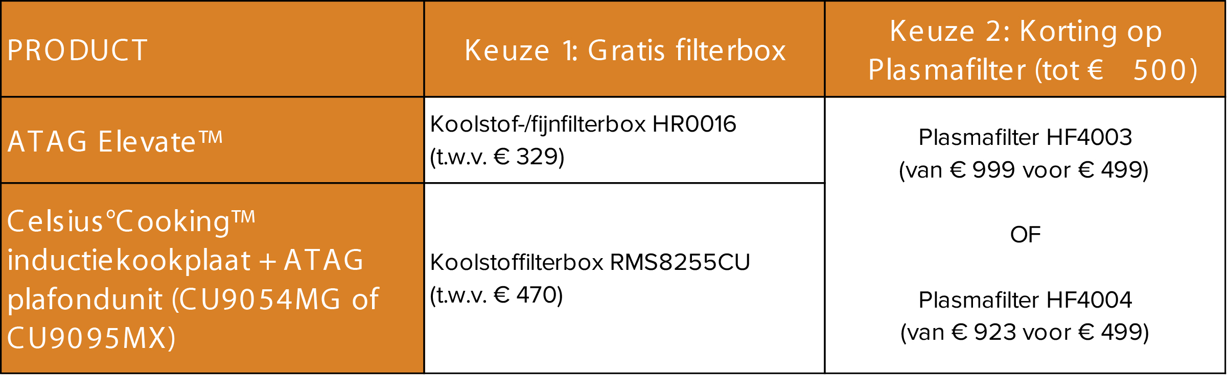 * Bij aankoop van een Celsius°Cooking™ inductiekookplaat in combinatie met een ATAG plafondunit (CU9054MG of CU9095MX) ontvang je de koolstoffilterbox RMS8255CU gratis of ontvang je € 500 korting op de plasmafilter HR4003.